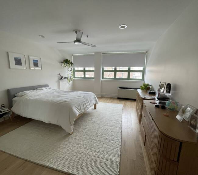 Elegant bedroom renovation with hardwood flooring and modern decor. Features a ceiling fan and natural light enhancements.